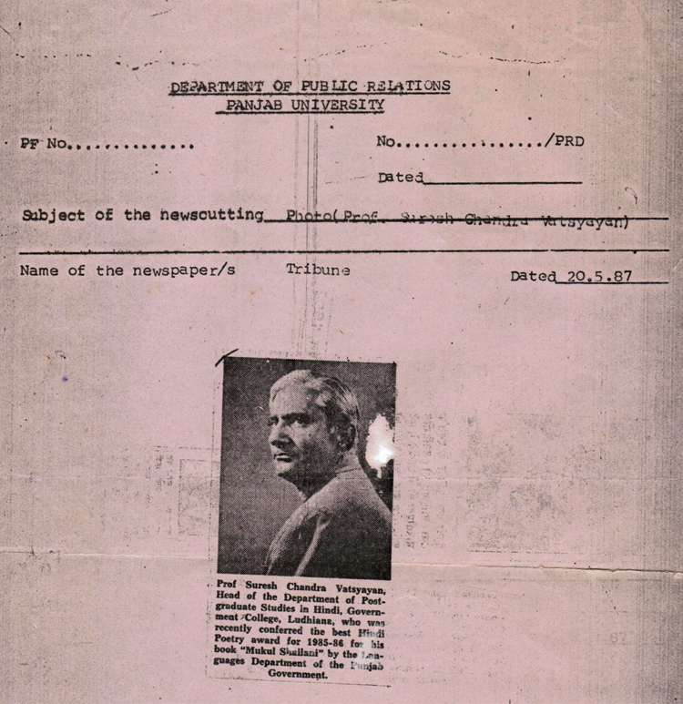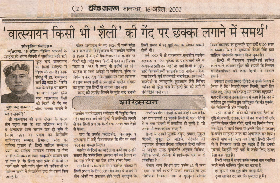 Dr Suresh Chandra Vatsyayan is a renowned Hindi poet. He was born on Feb 6th 1934, Pasrur, Distt. Sialkot (Now Pakistan).