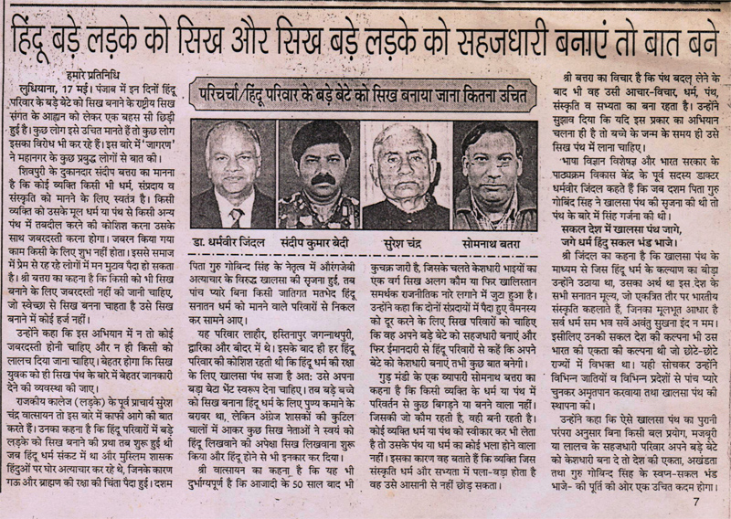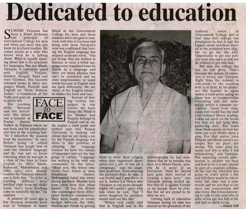 As a student: Front rank positions in studies, elocution, youth leadership as President of prestigious confederation of College Students Unions of Punjab, leader of Punjab Students Goodwill Mission to Jammu and Kashmir (1954), Monitor of the Punjab Youth contingent for Bhoodan Yojna (1954), editor of the quarterly Hindi magazine etc. etc., merited twice the College – Roll of Honour, the highest honour conferred by Govt. Post Graduate College, Ludhiana. As a Teacher : Post Graduate College Teacher in Hindi and Principal of various Govt. Colleges in Punjab (1955-1992), torchbearer of the family tradition of serving the national and global cause of Indian education with emphasis on the orient in general and redemption of Sanskrit-Hindi-Punjabi and also the languages of the third world from the imperialistic and impervious yoke of English and complexes of Anglic superiority in particular.